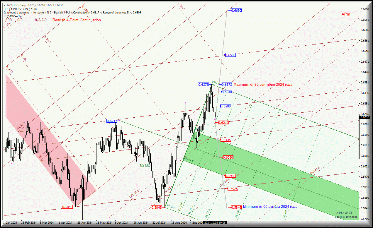 Новозеландский доллар - NZD/USD-Daily с 03 октября 2024 года продолжит свое движение в соответствии с отработкой и направлением пробоя канала 1/2 Median Line (0.6135 - 0.6210 - 0.6280) вил старшего операционного масштаба Minor-Daily.