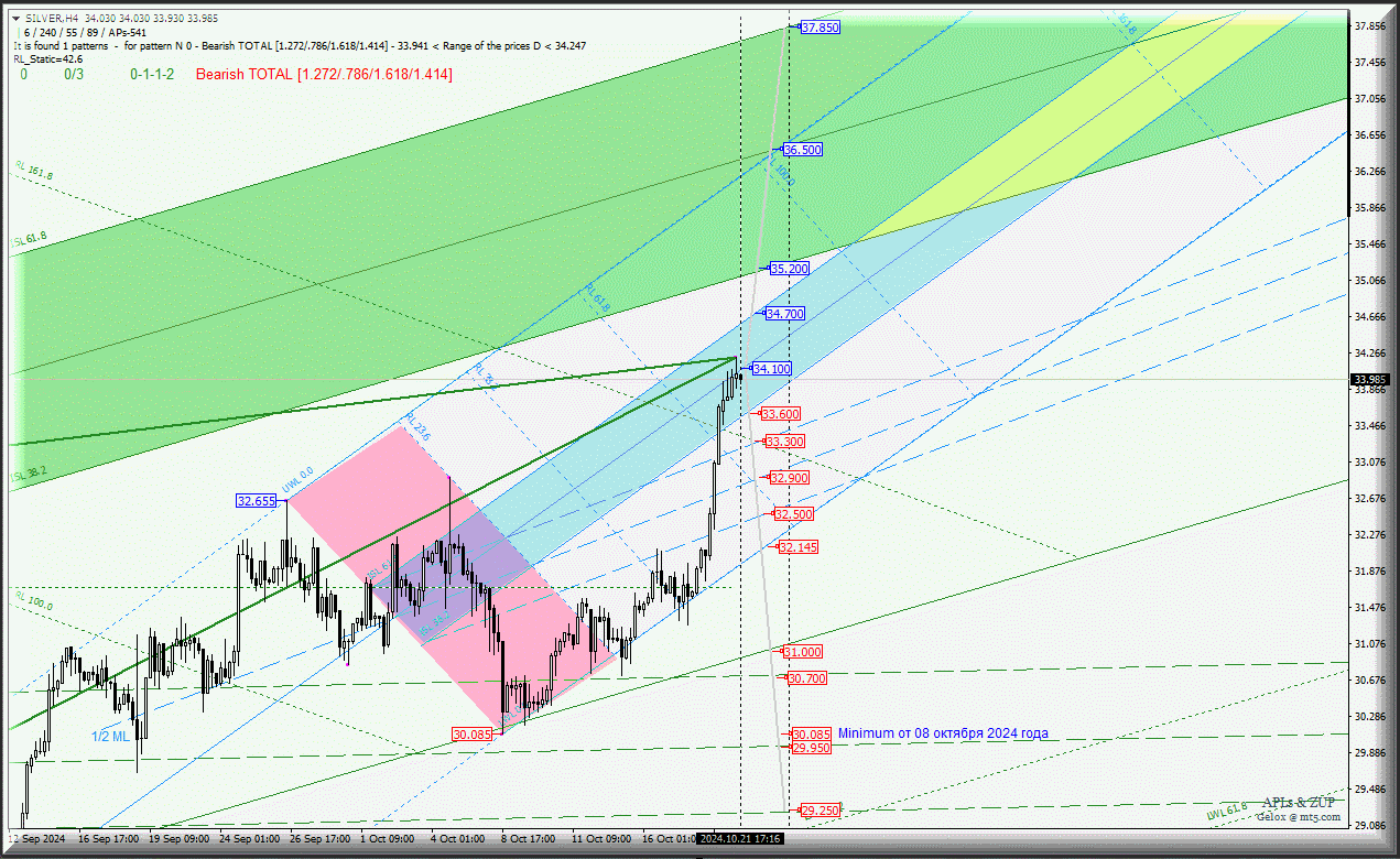 Развитие движения Spot Silver-h4 с 22 октября 2024 года будет продолжено в соответствии с отработкой и направлением пробоя границ зоны равновесия (33.600 - 34.100 - 34.700) восходящих вил младшего операционного масштаба Minuette-h1.