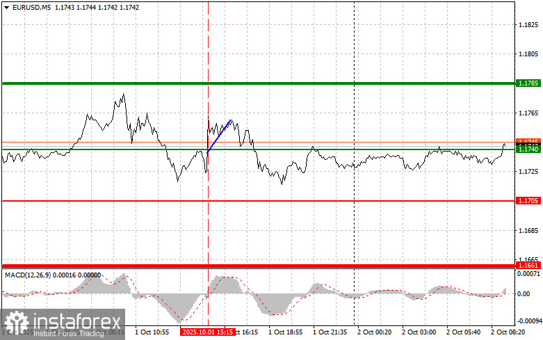 การทดสอบราคาที่ระดับ 1.1740 ได้เกิดขึ้นพร้อมกับช่วงที่ MACD เริ่มเคลื่อนที่ขึ้นมาจากเส้นศูนย์ ซึ่งยืนยันว่าเป็นจุดเริ่มต้นที่ถูกต้องในการซื้อยูโร ผลที่ได้คือ คู่เงินนี้เพิ่มขึ้น 15 จุดและการเคลื่อนไหวก็สิ้นสุดลง