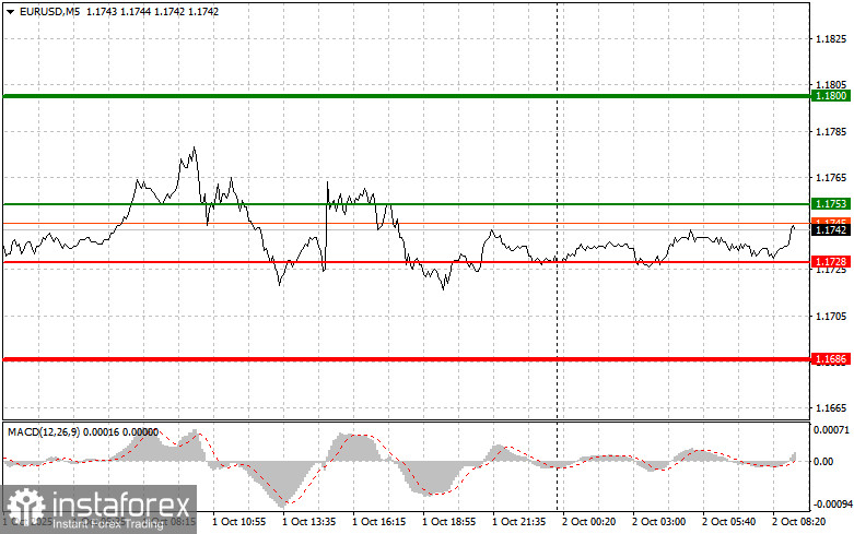 สถานการณ์ที่ #2: ฉันวางแผนจะซื้อค่าเงินยูโรวันนี้เช่นกัน ในกรณีที่มีการทดสอบระดับราคา 1.1728 สองครั้งติดต่อกัน ในขณะที่ดัชนี MACD อยู่ในพื้นที่ที่ขายมากเกินไป ซึ่งจะจำกัดศักยภาพในการลงของคู่เงิน และนำไปสู่การพลิกกลับตลาดขึ้น ในกรณีนี้สามารถคาดหวังการเติบโตถึงระดับตรงกันข้ามคือ 1.1753 และ 1.1800