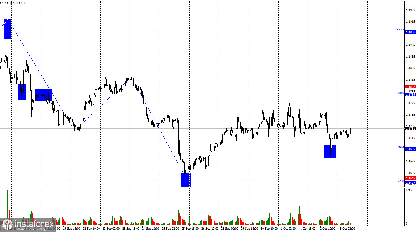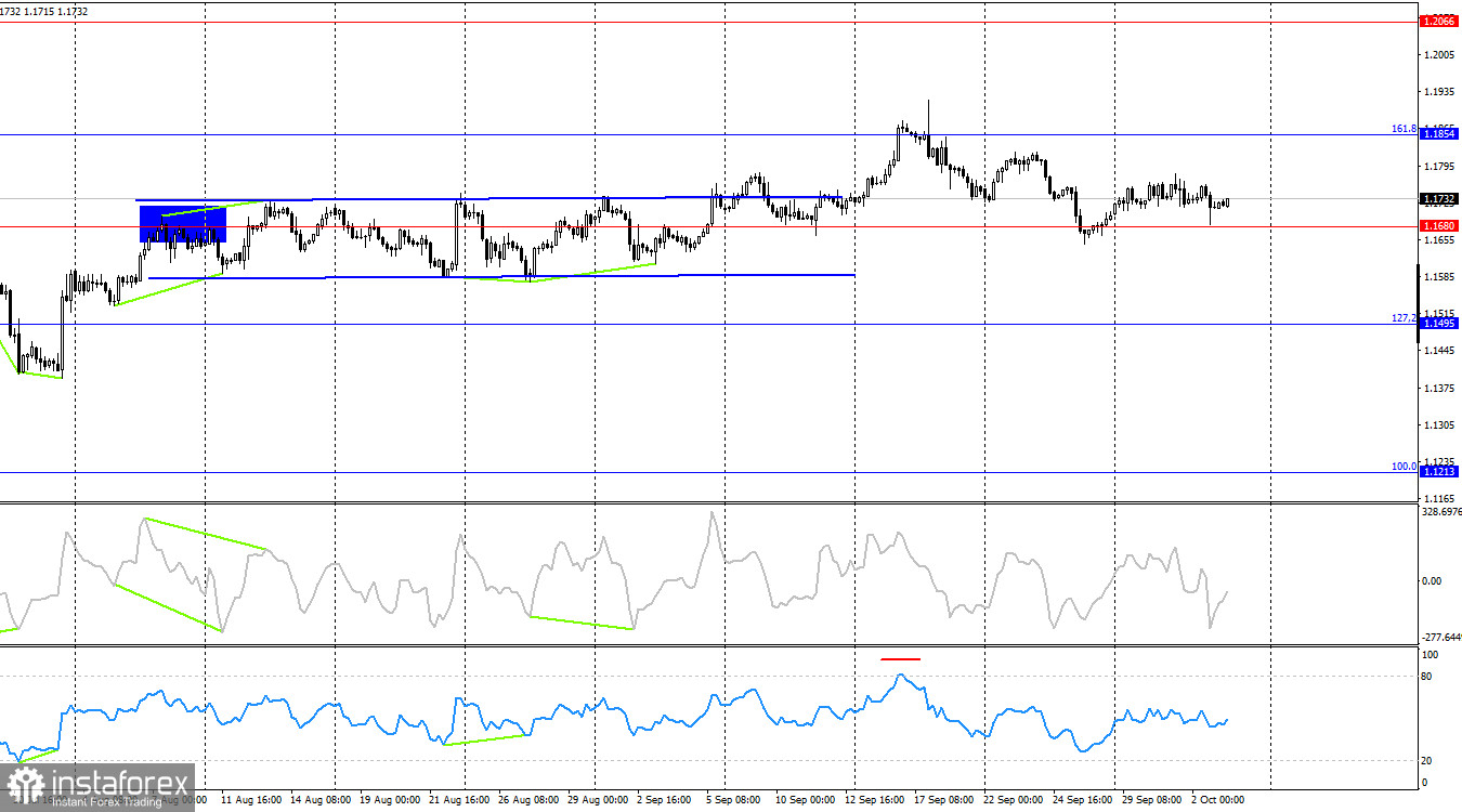 ในวันพฤหัสบดี มีเหตุการณ์ที่สำคัญเพียงหนึ่งเดียว นอกจากการเติบโตของ "shutdown" ที่ทุกคนกำลังพูดถึง ในยูโรโซน อัตราการว่างงานเพิ่มขึ้นเป็น 6.3% ในเดือนสิงหาคม ซึ่งเทรดเดอร์ไม่คาดหวัง ควรทราบว่าอัตราการว่างงานใน EU ได้ลดลงอย่างต่อเนื่องในช่วง 10 ปีที่ผ่านมา ดังนั้นการเพิ่มขึ้นครั้งเดียวของ 0.1% แทบจะไม่เป็นสาเหตุของความกังวลอย่างจริงจัง อย่างไรก็ตาม เทรดเดอร์ที่มีแนวโน้มขายได้ใช้โอกาสนี้ แต่เพื่อรักษาแนวโน้มการขาย เทรดเดอร์จะต้องการข่าวเพิ่มเติม - ไม่ว่าจะเป็นข่าวดีสำหรับดอลลาร์หรือข่าวไม่ดีสำหรับยูโร การรายงานแบบนี้อาจมีการตีพิมพ์วันนี้ แต่เนื่องจากการชัตดาวน์ ข้อมูลตลาดแรงงานและอัตราการว่างงานของสหรัฐฯ จะไม่ได้รับการตีพิมพ์ อย่างน้อยตามปฏิทินเศรษฐกิจอย่างเป็นทางการ ในทุกกรณี ตลาดแรงงานของสหรัฐฯ ยังคงเผชิญกับความยากลำบาก ซึ่งได้รับการยืนยันโดยรายงาน ADP ที่อ่อนแอในสัปดาห์นี้ ดูเหมือนว่าเทรดเดอร์สามารถพึ่งพาข้อมูลเหล่านั้นเท่านั้น