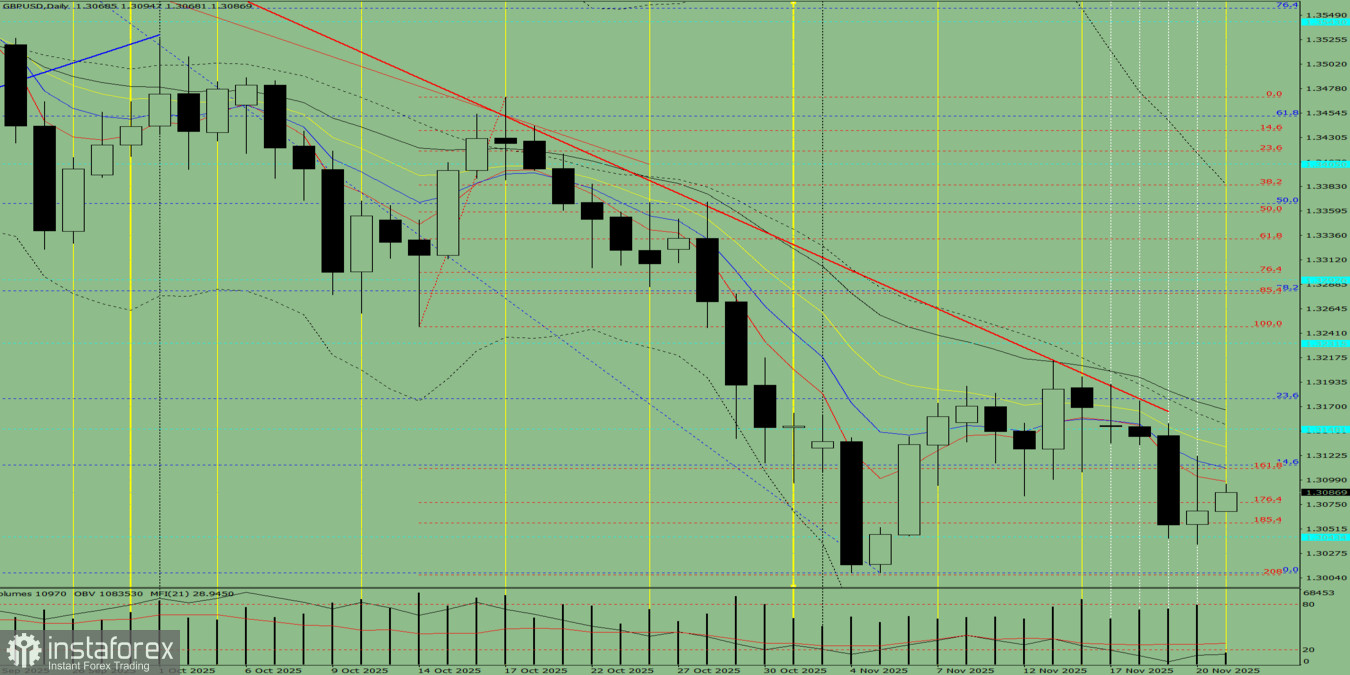Phân Tích Xu Hướng (Hình 1). Vào thứ Sáu, từ mức 1.3069 (giá đóng phiên của nến ngày hôm qua), thị trường có thể bắt đầu đi lên với mục tiêu ở mức 1.3113 – mức hồi 14.6% (đường nét đứt màu xanh). Khi kiểm tra mức này, có khả năng xảy ra hồi giảm với mục tiêu là 1.3098 – đường EMA 8 kỳ (đường mảnh màu xanh).