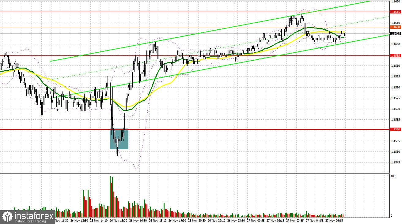 Vào ngày Thứ Tư, cặp EUR/USD đã tạo ra một số điểm nhập thích hợp vào thị trường. Hãy cùng xem xét biểu đồ 5 phút để hiểu rõ hơn về những gì đã xảy ra. Trong dự báo buổi sáng của tôi, tôi tập trung vào mức 1.1576 và dự định dựa vào nó để đưa ra quyết định giao dịch của mình. Sự giảm xuống và hình thành một giả phá vỡ xung quanh mức 1.1576 đã tạo ra cơ hội mua vào euro; tuy nhiên, cặp tiền tệ này không cho thấy sự tăng trưởng đáng kể. Trong nửa cuối của ngày, vị trí dài dựa trên một giả phá vỡ từ 1.1560 đã cho phép tái nhập vào vị trí dài, dẫn đến việc tăng hơn 40 pips.