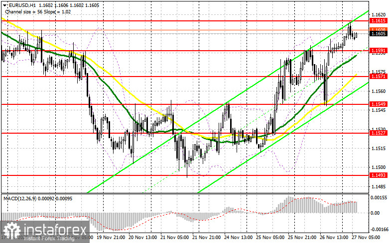 Số liệu về việc giảm yêu cầu trợ cấp thất nghiệp ban đầu tại Mỹ đã cung cấp một số hỗ trợ cho đồng đô la, nhưng rủi ro về việc cắt giảm lãi suất tiếp theo từ Ngân hàng Dự trữ Liên bang đã gây nặng lên hiện tượng này, dẫn đến việc giảm giá đồng đô la. Rất nhiều báo cáo được dự kiến sẽ diễn ra trong nửa đầu ngày hôm nay. Sự kiện sẽ bắt đầu với chỉ số tiên phong về khí hậu tiêu dùng GfK từ Đức, cũng như số liệu thống kê về tín dụng ngành tư nhân trong Khu vực đồng tiền Euro và thay đổi trong nguồn cung tiền M3. Sự kiện sẽ kết thúc với báo cáo từ cuộc họp chính sách tiền tệ của Ngân hàng Trung ương châu Âu, nơi ngân hàng trung ương giữ nguyên lãi suất. Biết rằng xu hướng tăng cho euro, hành động tốt nhất là nhờ các mức giảm. Tôi dự đoán lần đầu tiên người mua xuất hiện xung quanh mức hỗ trợ 1.1591, được hình thành bởi kết quả của ngày hôm qua. Việc phá vỡ sai ở đây sẽ cung cấp một điểm vào các giao dịch dài hạn với mục tiêu phục hồi đến mức kháng cự 1.1615. Việc xuyên thủng và kiểm tra lại phạm vi này sẽ xác nhận hành động mua euro chính xác trong sự chờ đợi sự thúc đẩy lớn hơn đến 1.1635. Mục tiêu xa nhất sẽ ở xung quanh 1.1655, ở đó tôi sẽ thu lợi nhuận. Thử nghiệm ở mức này sẽ tăng cường thị trường tăng cho euro. Trong trường hợp giảm của EUR/USD và không có hoạt động xung quanh 1.1591, áp lực bán sẽ tăng, dẫn đến sự di chuyển đến mức tiếp theo thú vị ở 1.1571. Chỉ việc hình thành một phá vỡ giả ở đây sẽ là điều kiện thích hợp để mua euro. Tôi dự định mở các vị trí mua dài hạn ngay lập tức khi có sự nảy lên từ đáy ở 1.1549, nhắm vào một việc điều chỉnh trong ngày 30-35 pips.